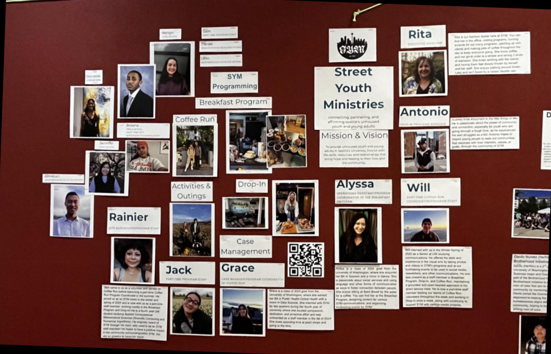 Within the UDYC Collective made up of Doorway Project, SYM, ROOTS, Ryther, Interagency High School and Teen Feed, SYM is renting the UDYC building from University Congregational United Church of Christ as we work with partner organizations to provide wraparound care for young people experiencing homelessness. Historically called "The Gold House" for its original color, UDYC has housed many services and organizations over the years, all in support of unhoused and at-risk youth and young adults in the U District. UCUCC has been an instrumental partner for each and every organization that has operated out of the space. For the month of February, the UCUCC hallway in front of the foyer will be decked with photos and text highlighting the collective work happening just across the alley from the church. The congregation will greatly appreciate having context for their current neighbors!