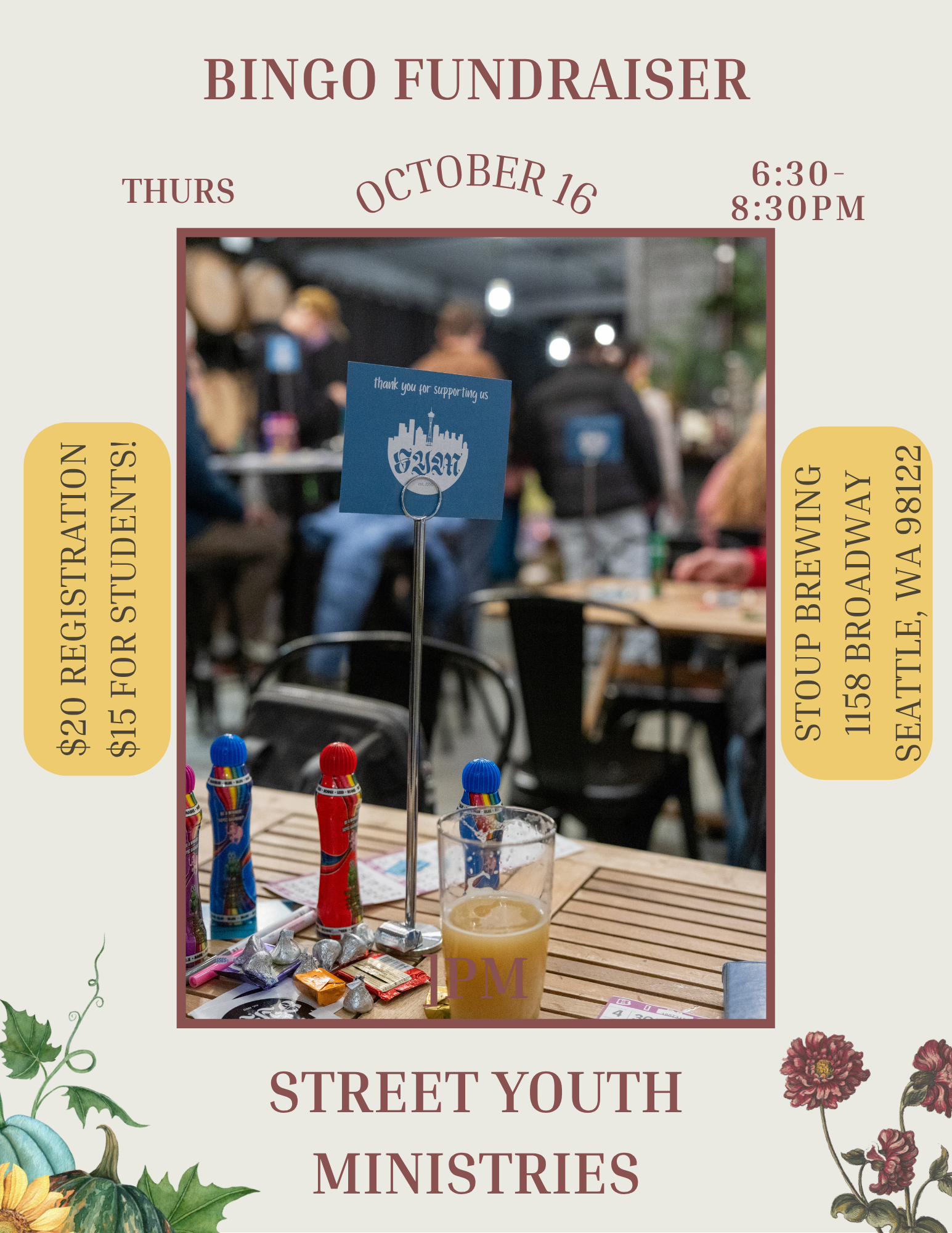 Join us on Thursday, October 16 for SYM's Fall Bingo Fundraiser! We are so excited to take this event to Stoup Brewery in Capitol Hill this year! Come to compete for AMAZING GIFT BASKETS filled with items donated from local businesses and give throughout the night to Street Youth Ministries to support our growing programming. |